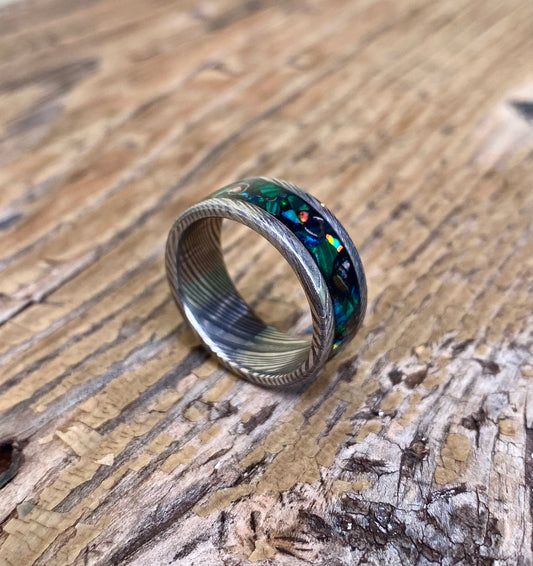 Anello di Acciaio Damasco ed Opale "Peacock Blue"