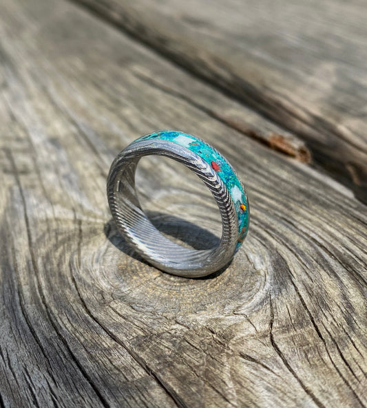 Anello di Acciaio Damasco ed Opale "Peacock Blue"