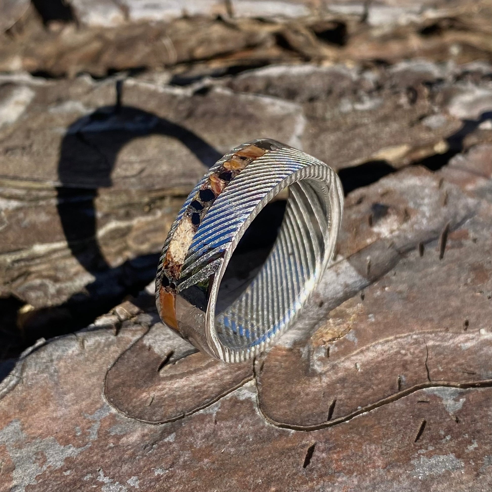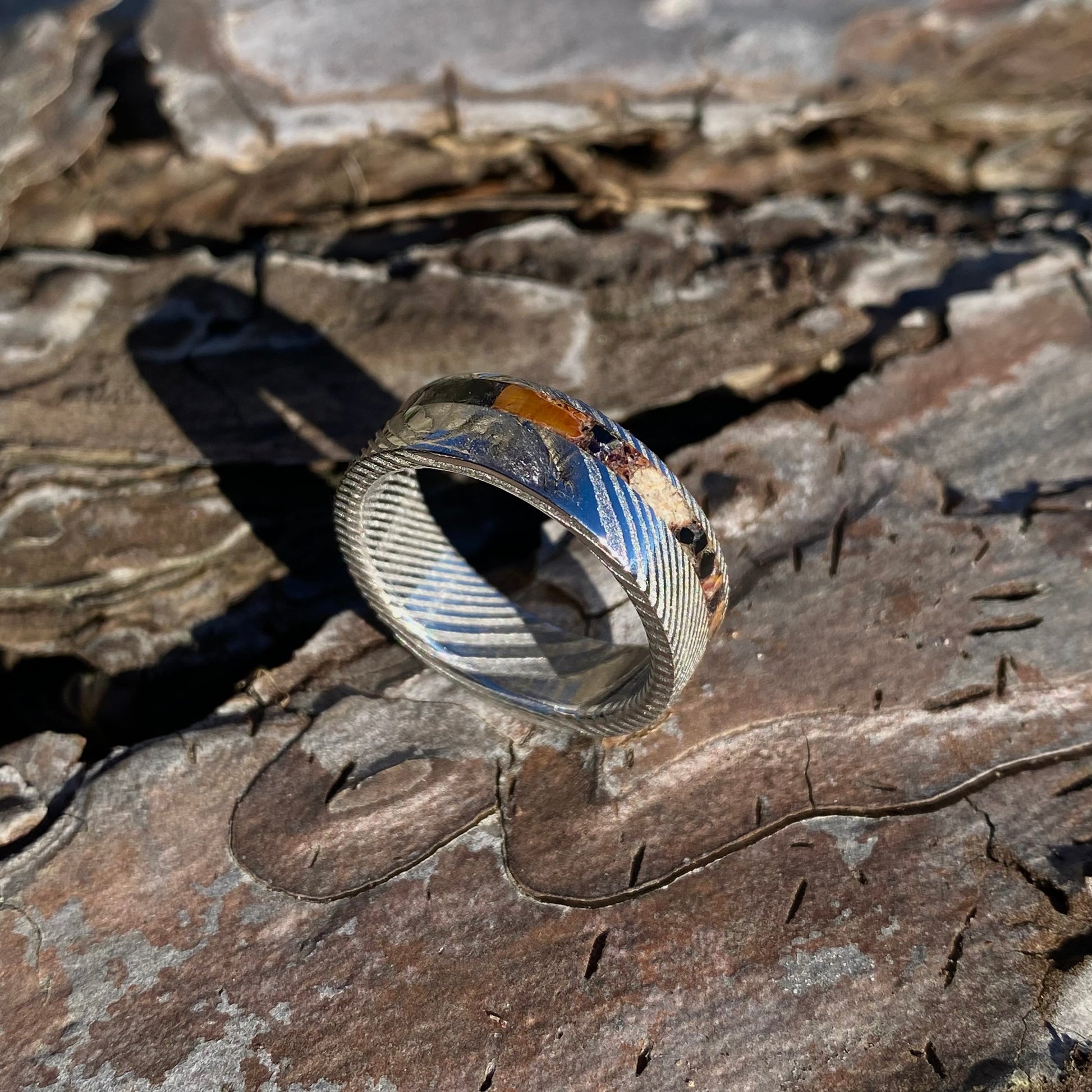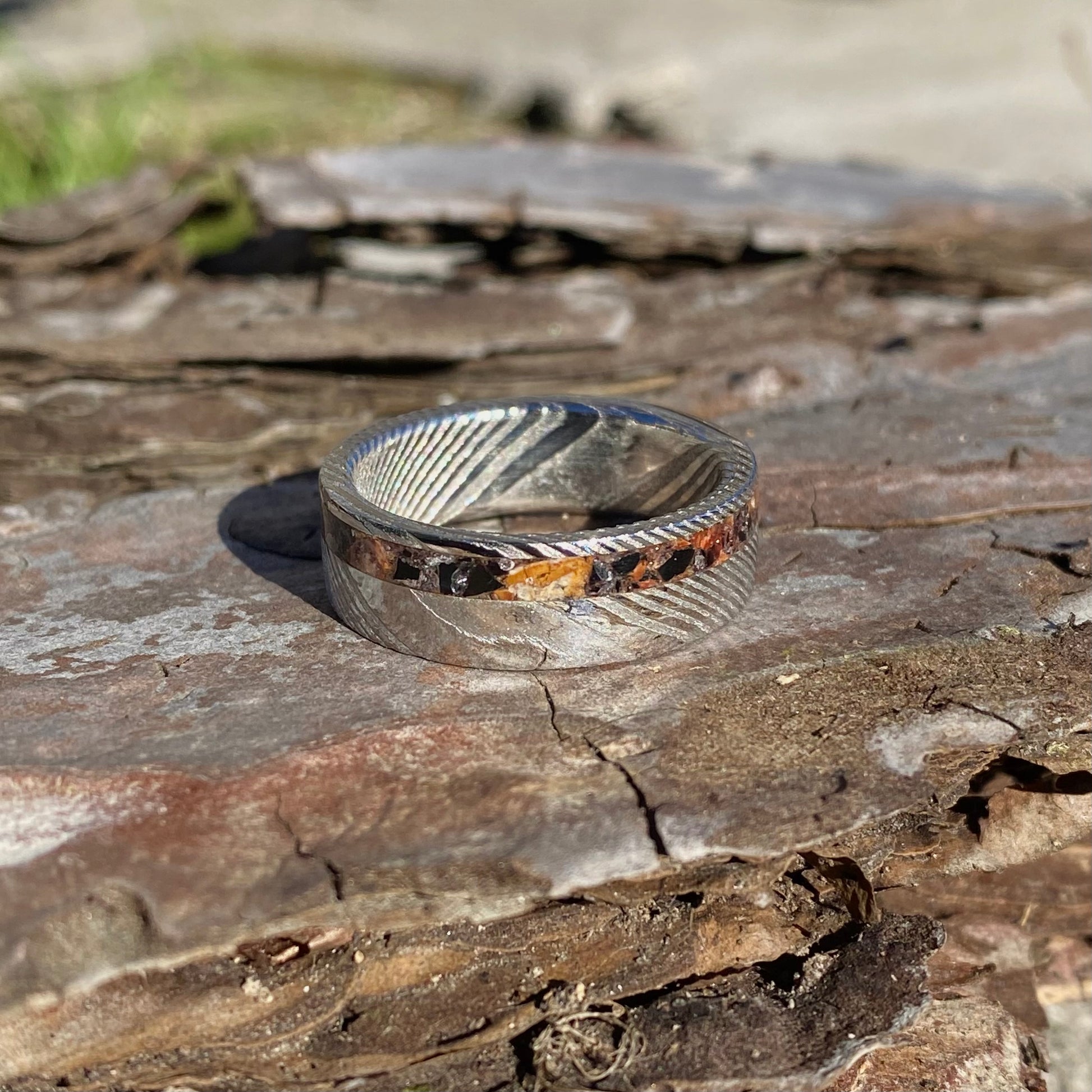 L' acier inoxydable Damas (304x316) utilisé pour fabriquer cette bague est un alliage inoxydable fabriqué à la main, ce qui signifie que chaque bague possède un motif unique et inimitable .