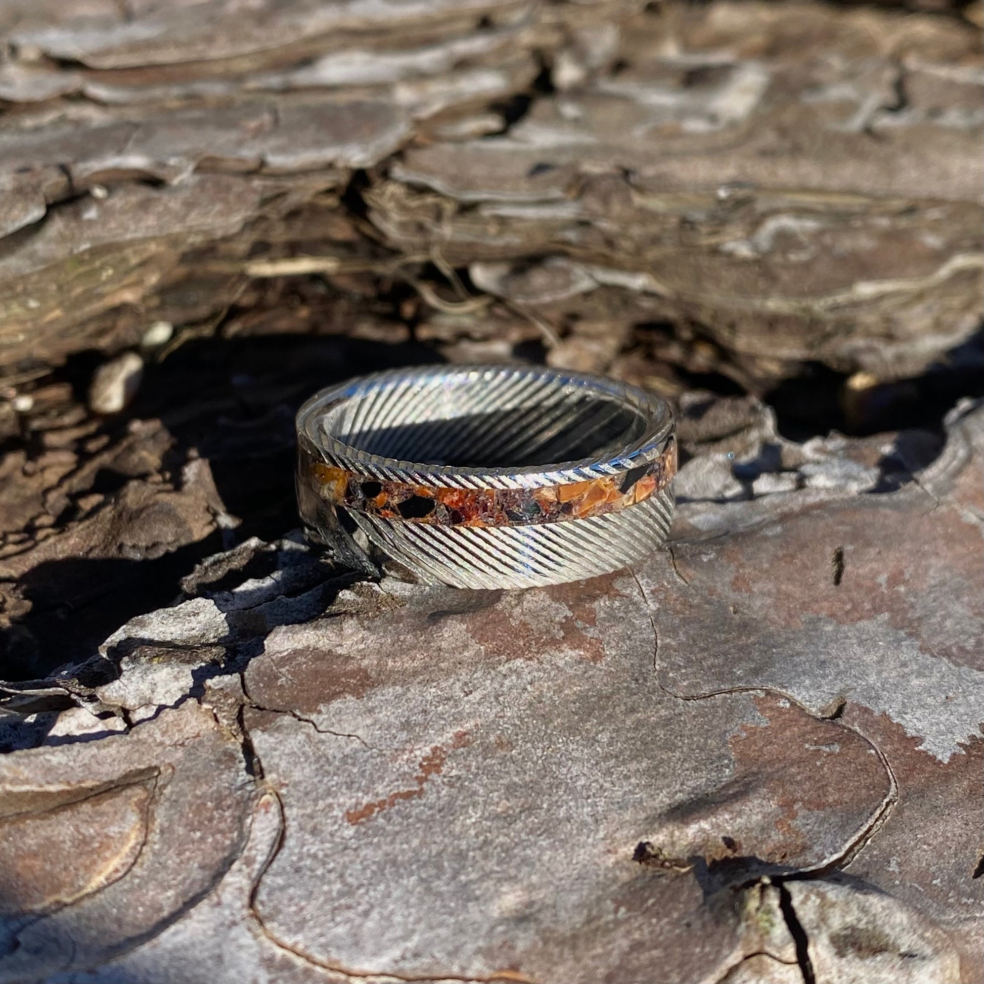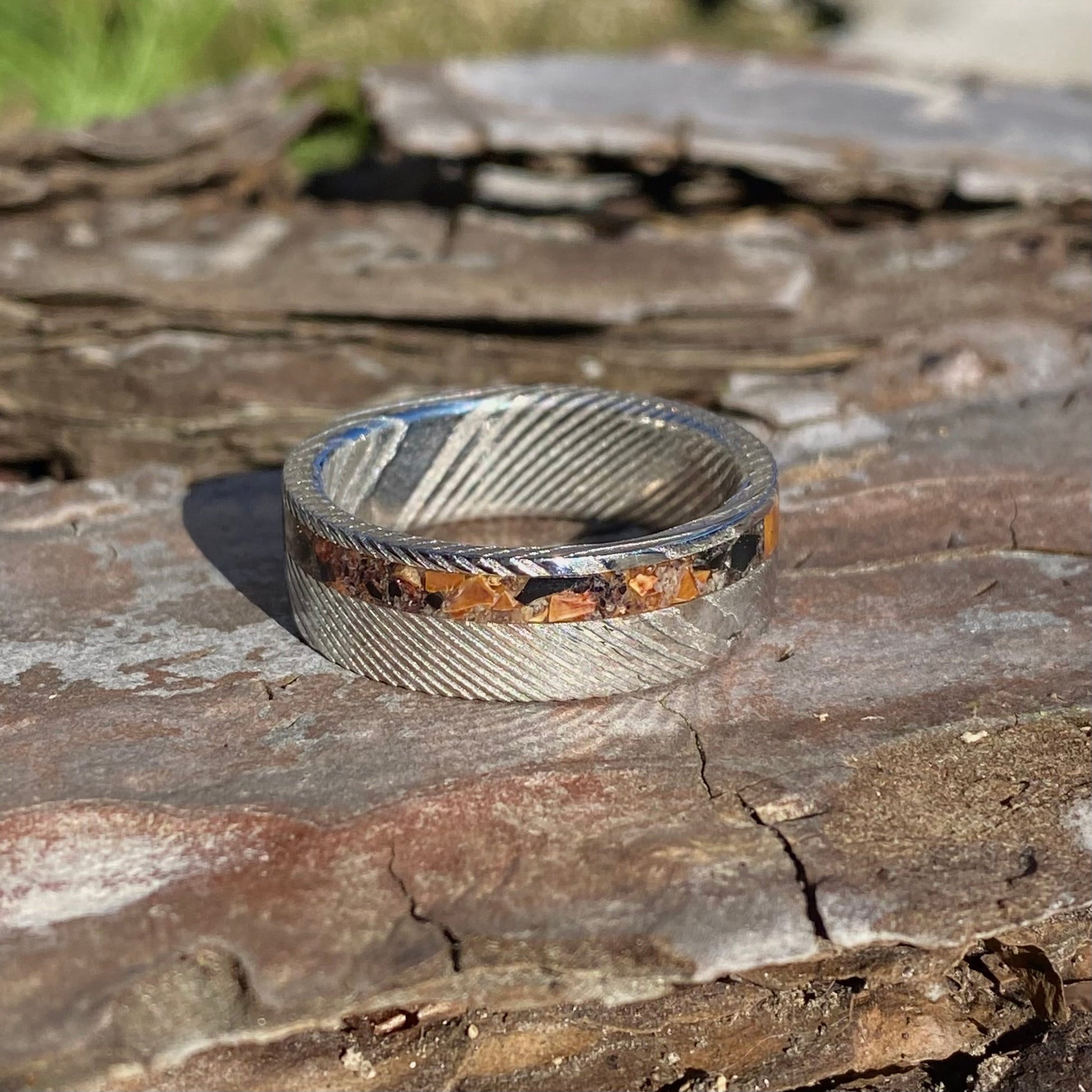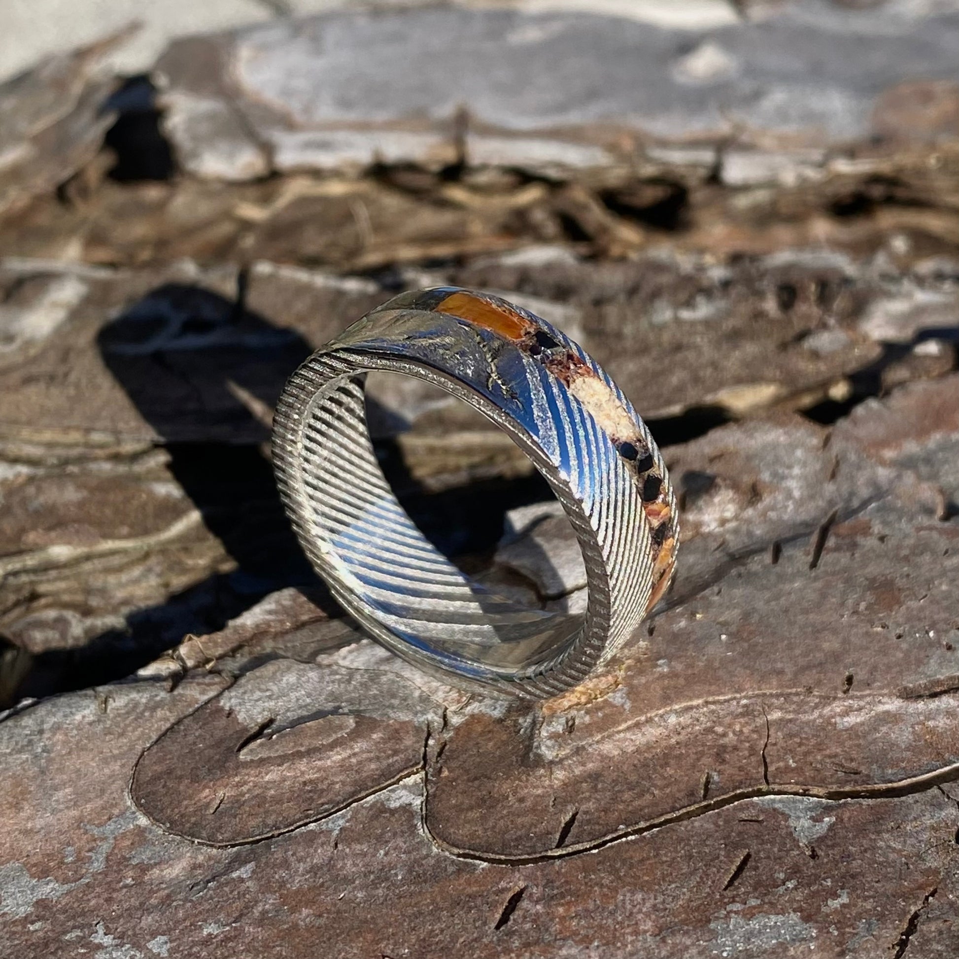 L' acier inoxydable Damas (304x316) utilisé pour fabriquer cette bague est un alliage inoxydable fabriqué à la main, ce qui signifie que chaque bague possède un motif unique et inimitable .