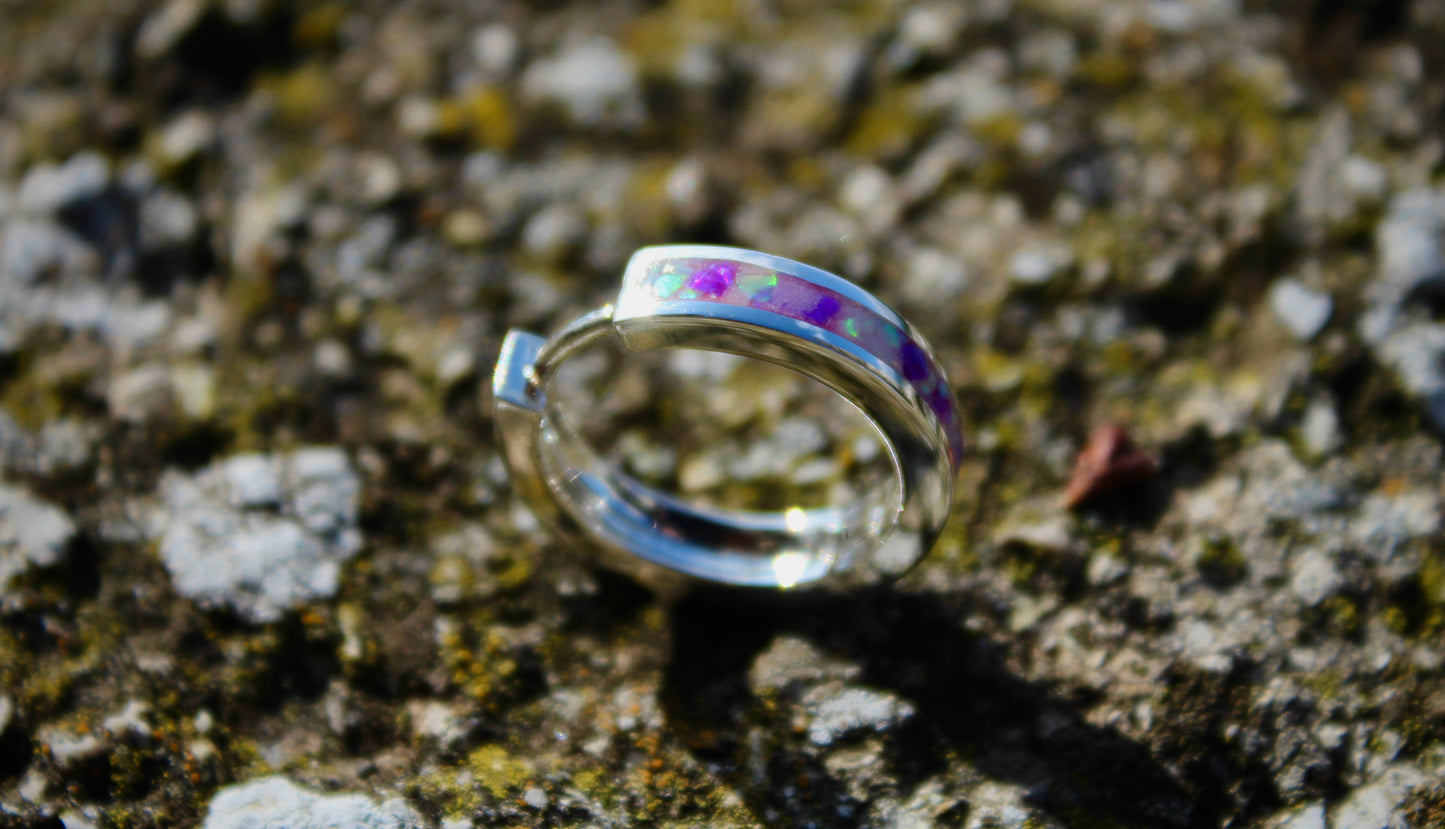 Ces boucles d'oreilles artisanales sont constituées d'une base en argent 925 avec une incrustation de fragments d'opale « Pearl White » et d'opale « Lavender ».