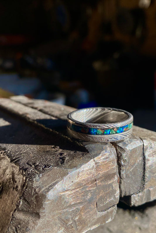 Anello di Acciaio Damasco, Giada Verde, Opale e Rame